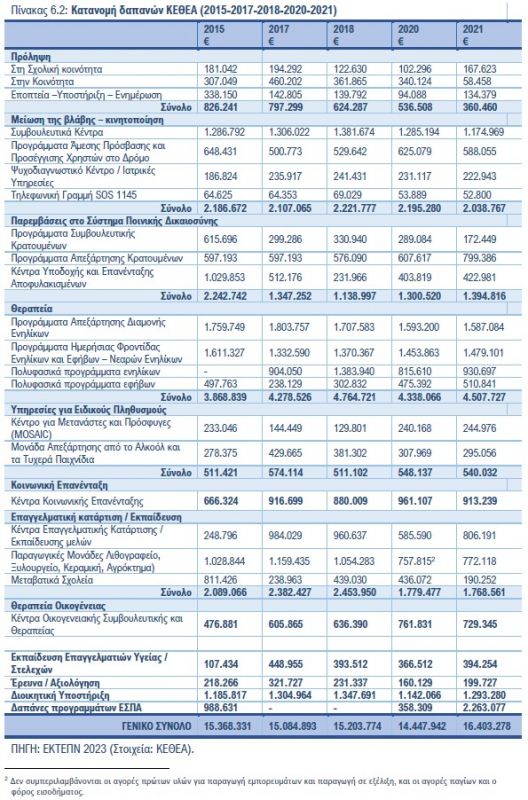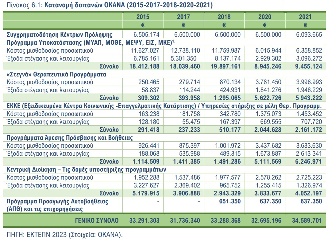 Το 2021 σημειώθηκε αύξηση τις δαπάνες του ΟΚΑΝΑ και του ΚΕΘΕΑ σε σύγκριση με την προηγούμενη 6ετία (2015-2020) η οποία οφείλεται κυρίως στη χρηματοδότηση των δομών θεραπείας και μείωσης τις βλάβης αυτών των φορέων από τα προγράμματα ΕΣΠΑ (Πίνακες 6.1 και 6.2).