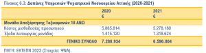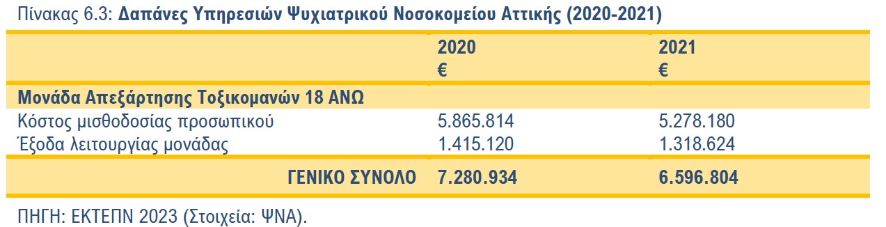 Από την άλλη πλευρά, οι δαπάνες των μονάδων θεραπείας των Ψυχιατρικών Νοσοκομείων της Αθήνας και της Θεσσαλονίκης παρουσίασαν μείωση συγκριτικά με τα προηγούμενη έτη (Πίνακες 6.3 και 6.4).